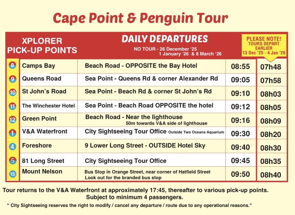 ケープポイントとボルダーズビーチを巡る日帰りツアーの流れは、以下の通りです。