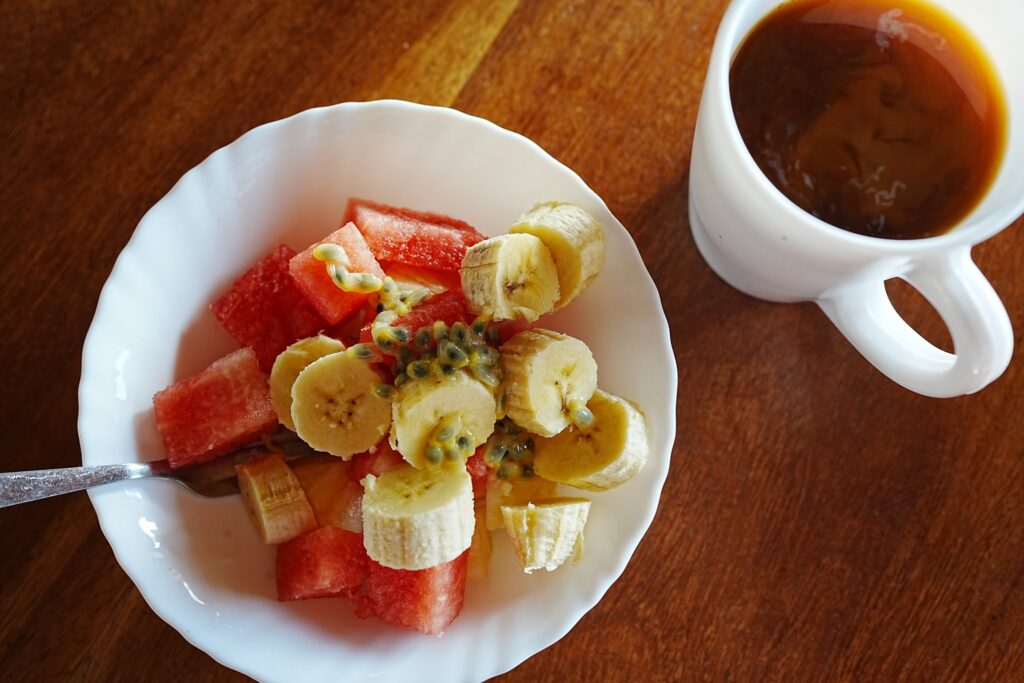 まず最初に、フルーツボウルとコーヒー(紅茶も可)が出てきました。