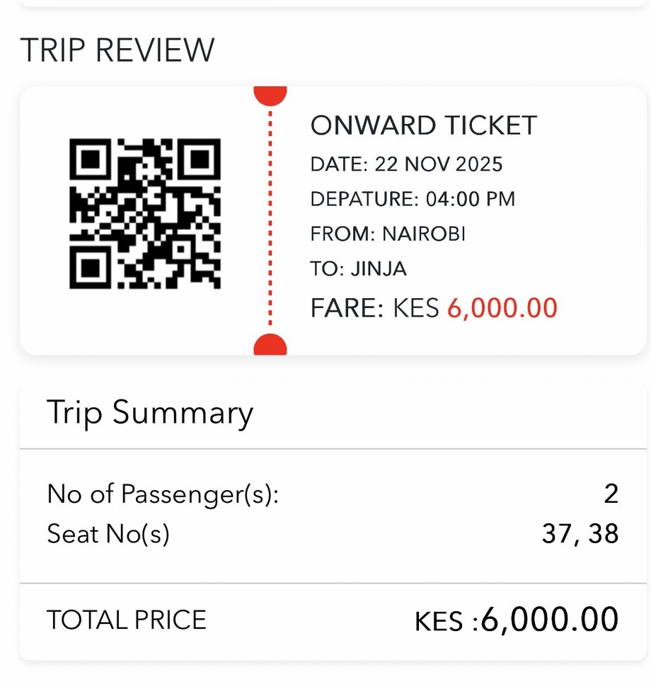 料金は出発時刻や座席タイプによって異なりますが、1人3000KES(約3,600円)でした。(※カンパラ行きでも途中のジンジャ行きでも同じ料金)