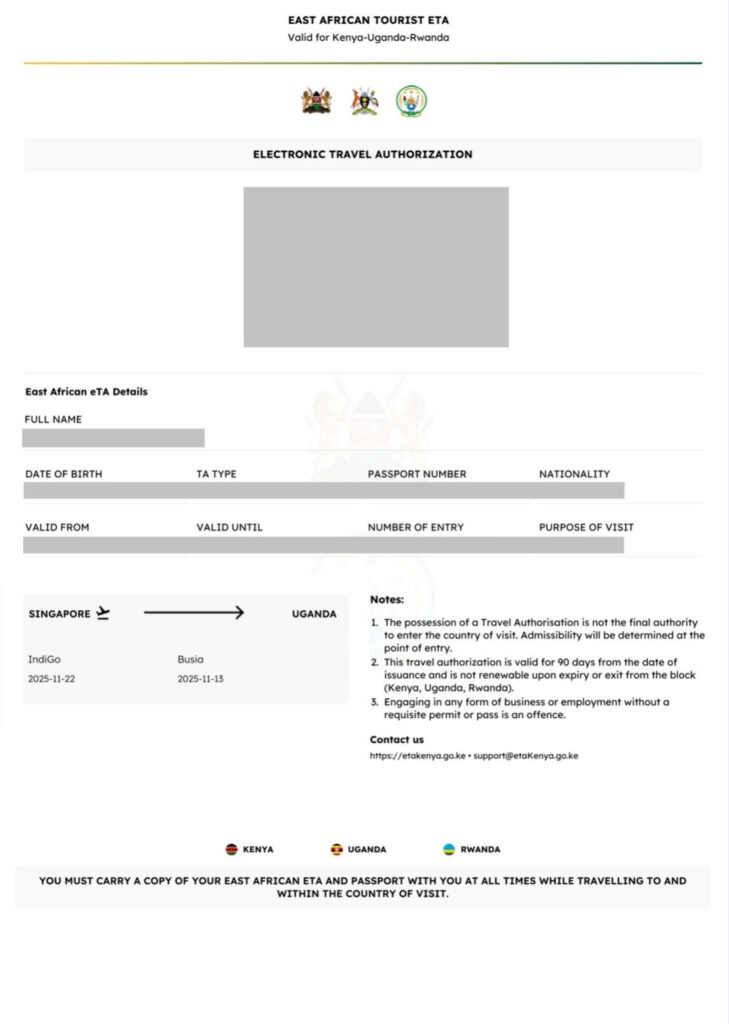 2025年11月現在、東アフリカeTAは無効です。(※2024年3月に旅された方は使えたそうですが、現在は使えません。)システム上、ケニアのeTA申請時に東アフリカeTAも取得できるようになっていますが、ウガンダ・ルワンダでは使えないので選択しないように注意してください。