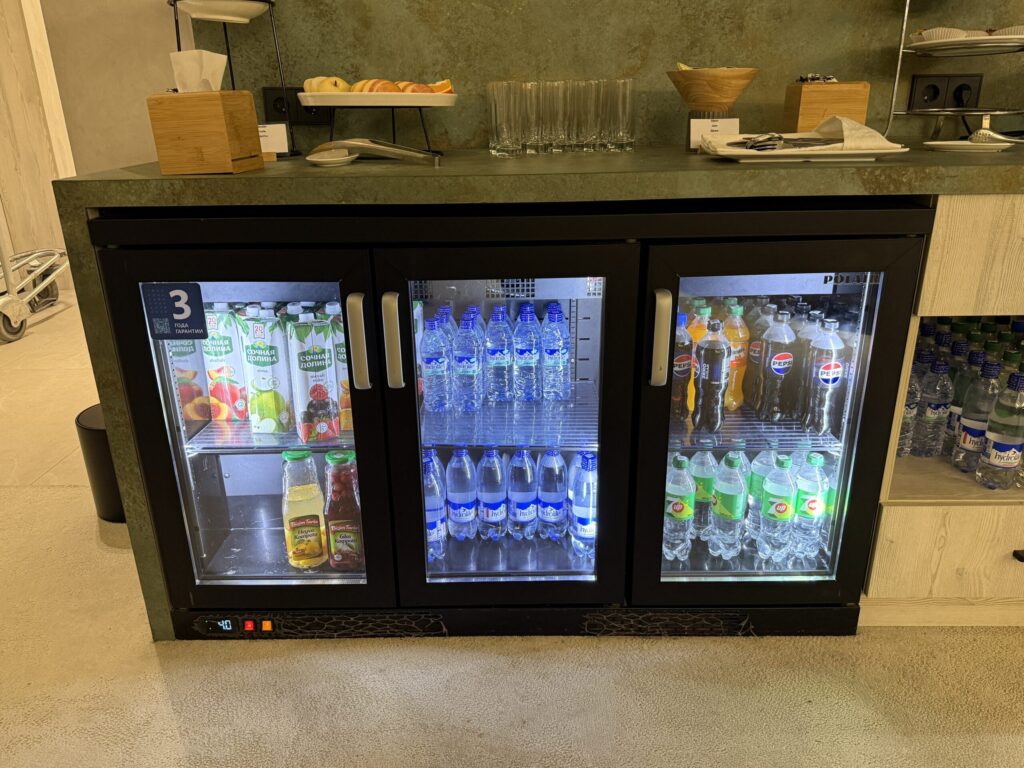 ラウンジ内では、ドリンクをはじめ、スナック(クッキーやナッツなど)が提供されており、コンセントの設備も整っています。
