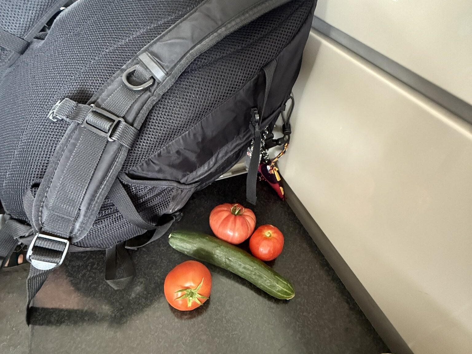 待合室にいたおばあさんが、自家製の(?)トマトときゅうりをくれました。
