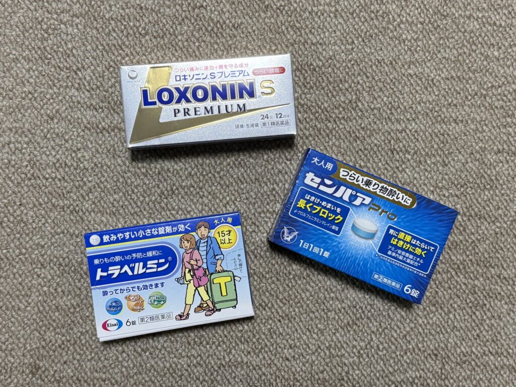 あとは、ロキソニンと酔い止めです。アフリカは道が悪いことが多く、陸路での長距離移動も多いためです。