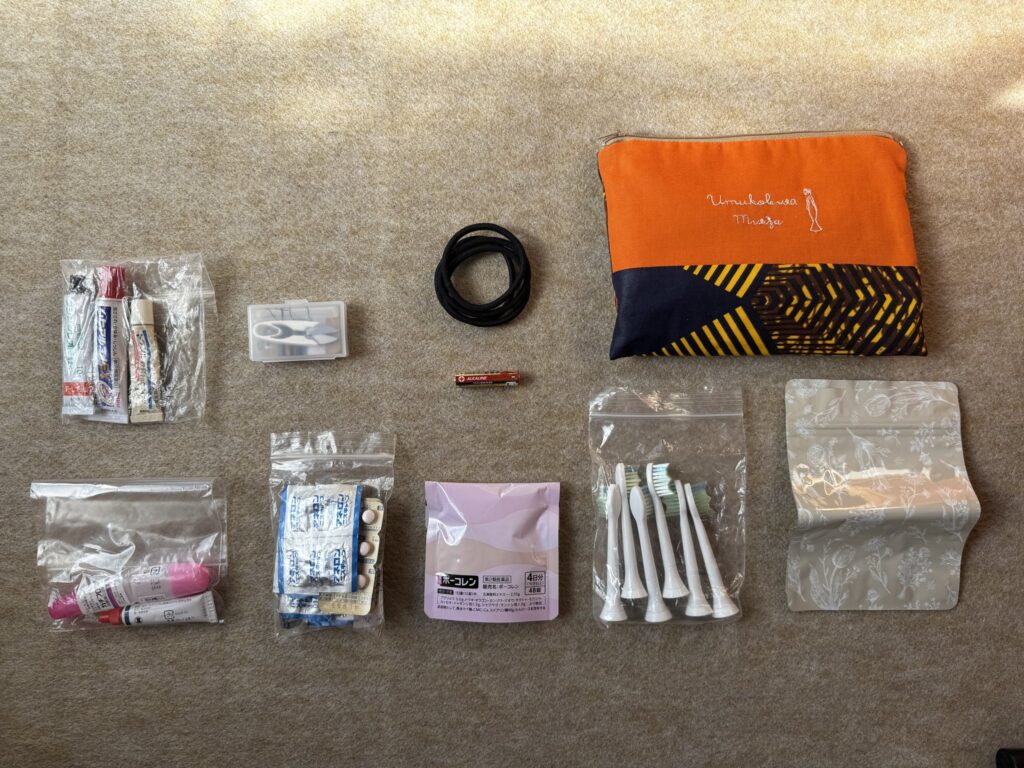女性の旅人なら悩むであろうメイクポーチ。元々化粧品が多かったのですが、かなり減らしました。