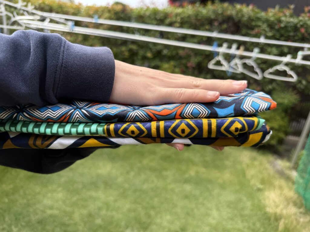 私は普段アフリカ布の服を着るので、服装に合うように手ぬぐいは無地のものを使っています。発色がよく、パッキッとした色でアフリカ旅にもぴったりです。