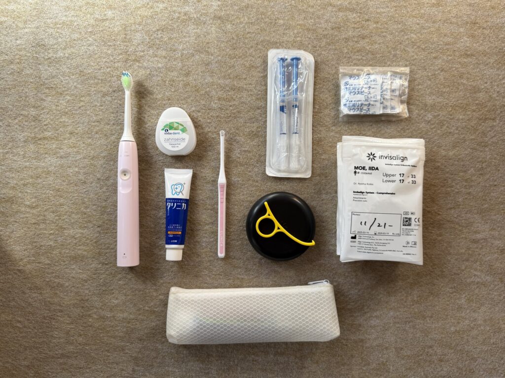 実は、歯列矯正(インビザライン)をしています。半年に一度しか歯科に行くことができないので、マウスピースを数ヶ月分まとめてもらっています。通っている歯科医師と相談し、一つのマウスピースを2週間程度使うようにしています。