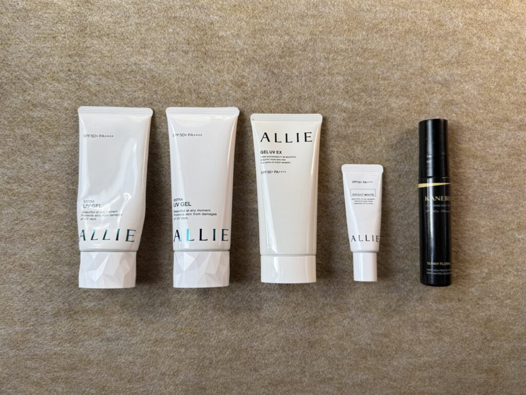 他の日焼け止めを使って焼けたことから、アリー信者になりました。量は、新品2本と使いかけ1本。あとは、顔用のミニサイズといただきもののスプレーです。