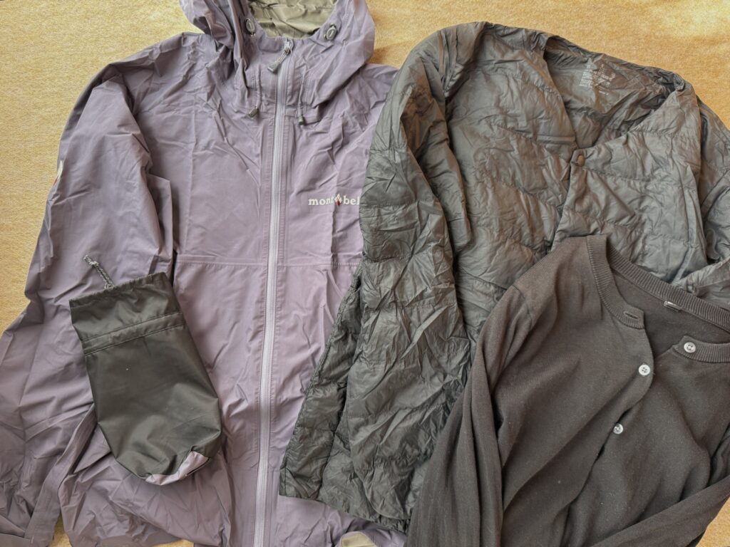 レインジャケットはmont-bellのものです。ライトダウンは無印のもの。基本的に夏の国に行くようにしていますが、バルト三国や北欧ではよく使いましたし、1日の寒暖差が激しい砂漠やアフリカでも重宝します。カーディガンはUNIQLOで、日焼け対策や肌を隠すためにもよく着ています。
