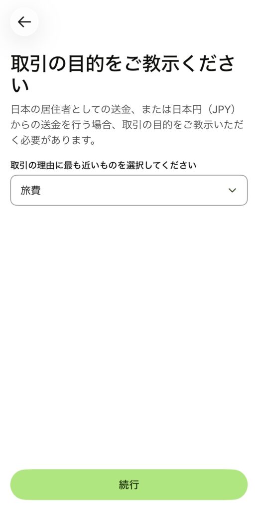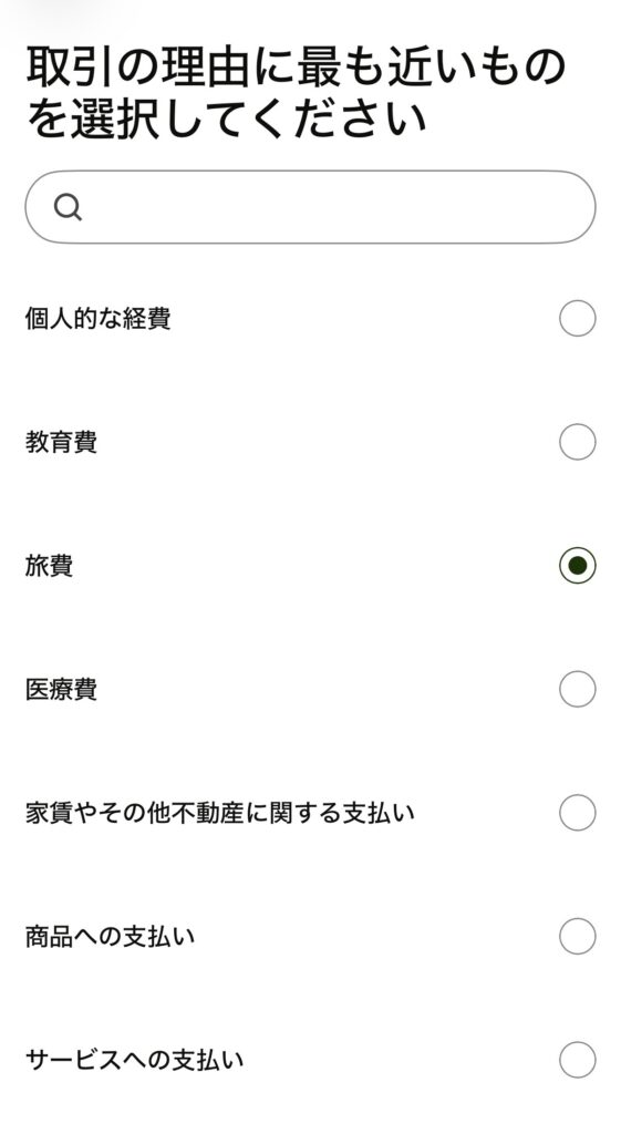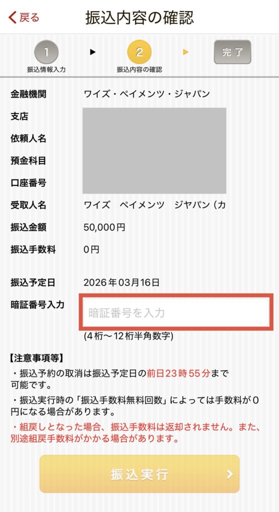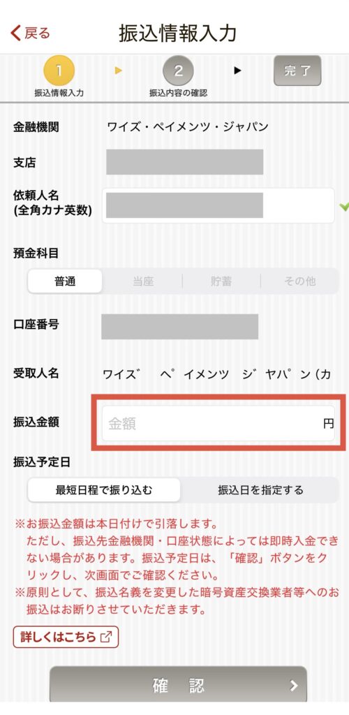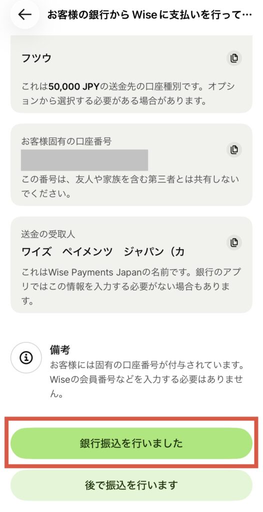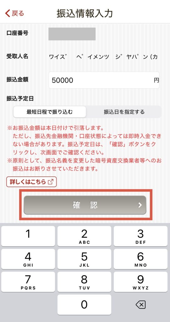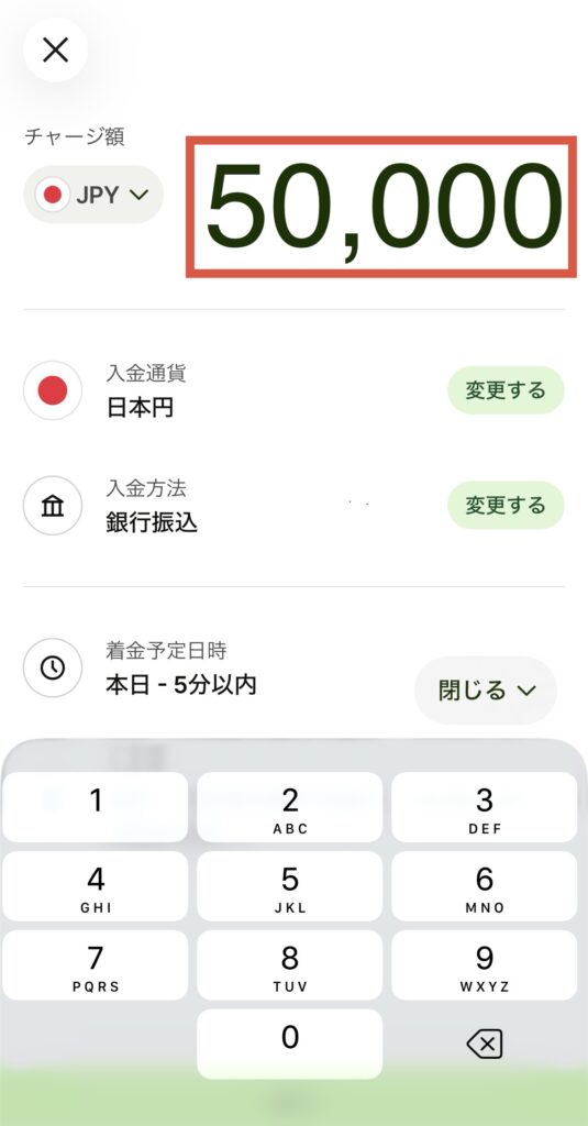 先ほどWiseアプリで50,000円と入力したので、こちらにも同額の50,000円を入力します。