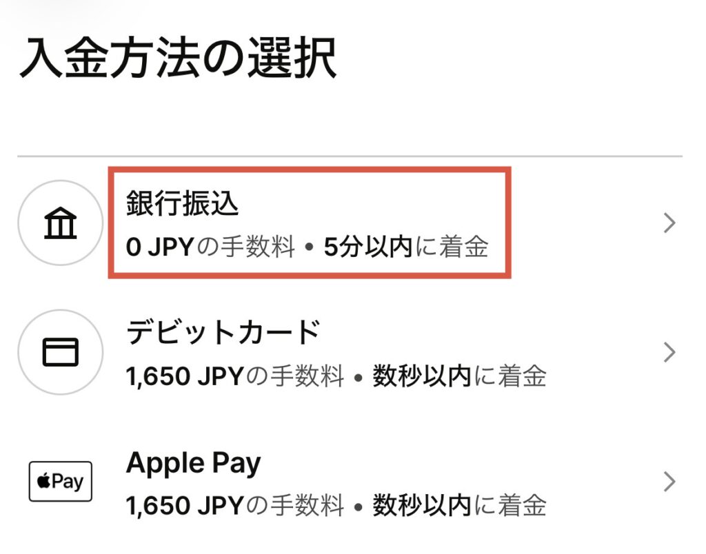 入金方法は、「銀行振込」を選択します。他の選択肢は手数料がかかってしまいます。