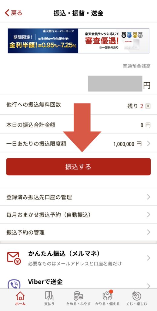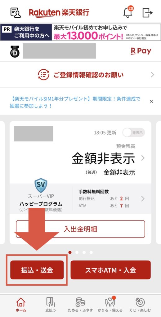 楽天銀行のアプリを開くと、このような画面が出てきます。