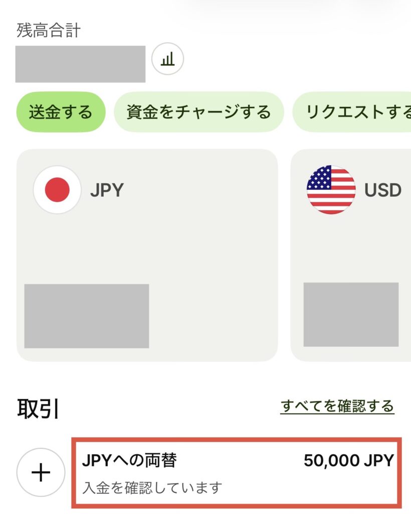 取引のところに、「入金を確認しています」と表示されます。金額も50,000円と合っています。