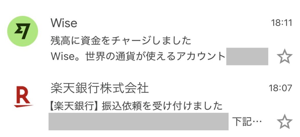 楽天銀行で振込依頼が完了してから、たったの4分後にWiseアカウントへのチャージが完了しました。